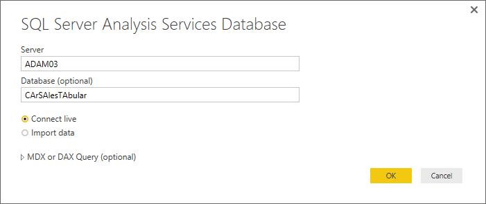 - Enter the Server name and the database name (CarSalesTabular in the sample data) in the SQL Server Database connection dialog..