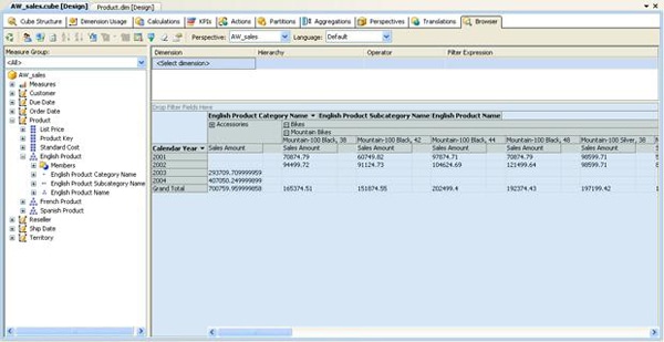 To browse the cube data in Analysis Services, open the AW_sales cube in BIDS, and then select the Browser tab (shown in Figure 11). Drag the Calendar Year attribute from the Order Date dimension to the Drop Row Fields Here section of the browser, and then drag the Sales Amount measure from the Fact Internet Sales measure group to the Drop Totals or Detail Fields Here section. Now expand the Product dimension in the Measure Group pane. Notice that the hierarchies are included in the dimension tree. Expand the English Product hierarchy, and drag the English Product Category Name attribute to the Drop Column Fields Here section in the browser.