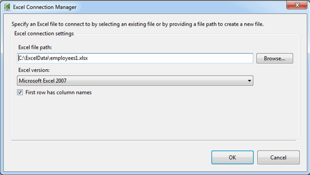 Figure 1: Configuring an Excel connection manager to point to an Excel workbook