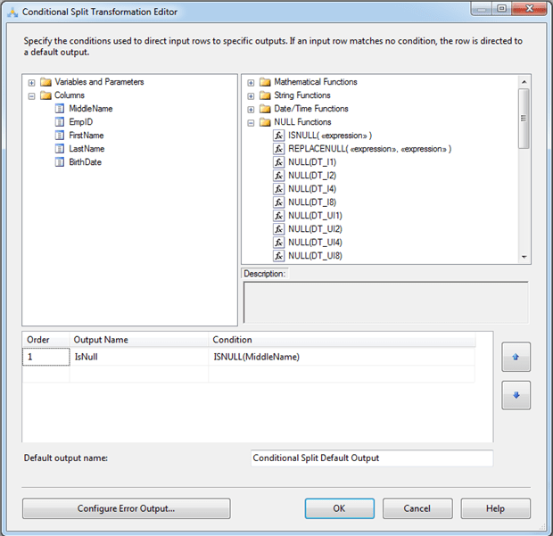 The key to this configuration is to define a condition in our Conditional Split transformation that redirects the rows. This is easily done by using the ISNULL function to check the MiddleName value for each row. If the value is NULL, the row is sent to the IsNull output. Figure 12 shows the Conditional Split Transformation Editor with the ISNULL expression defined for the IsNull output.