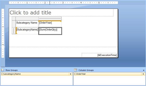 It’s not only the matrix itself that you should be aware of. Notice at the bottom of the design surface there are two windows: RowGroups and ColumnGroups. Report Builder automatically defines your initial groups based on the fields you added to the matrix. Because the SubcategoryName field is added as a row, Report Builder creates a row group that includes the SubcategoryName field. The same goes for the OrderYear field. Because it’s added as a column, Report Builder creates a column group that includes the OrderYear field.