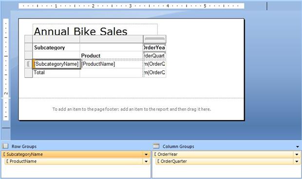 As you can see, a new row has been added for the OrderQuarter field and a new column for the ProductName field. This is the method that Report Builder uses to indicate that the groups now have multiple levels. Also notice that the new fields have been added as second levels to the groups shown in the RowGroups and ColumnGroups windows.