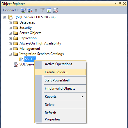 After we have created the Catalog, we can create a new folder under it, which will contain our first project. To create the folder, simply right-click on the SSISDB catalog and click ‘Create Folder‘: