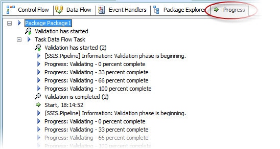 You can also find details about the package’s execution on the Progress tab (shown in Figure 26). The tab displays each step of the execution process. If there is an error, a red exclamation mark is displayed next to the step’s description. If there is a warning, a yellow exclamation mark is displayed. We will go into resolving errors and how to find them in a future article.
