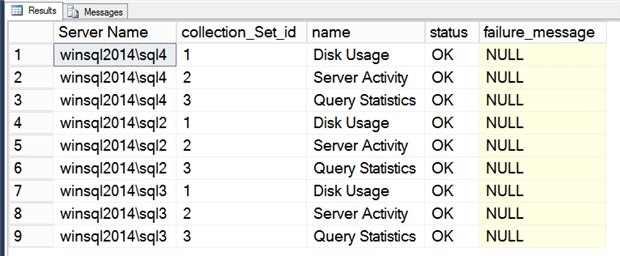 use msdb select a.collection_Set_id,b.name, case status when 2 then 'failed' else 'OK' end status ,failure_message from syscollector_execution_log a, syscollector_collection_sets b where a.collection_set_id=b.collection_set_id and log_id in ( select max(log_id) from syscollector_execution_log where parent_log_id=0 group by collection_set_id ) |
