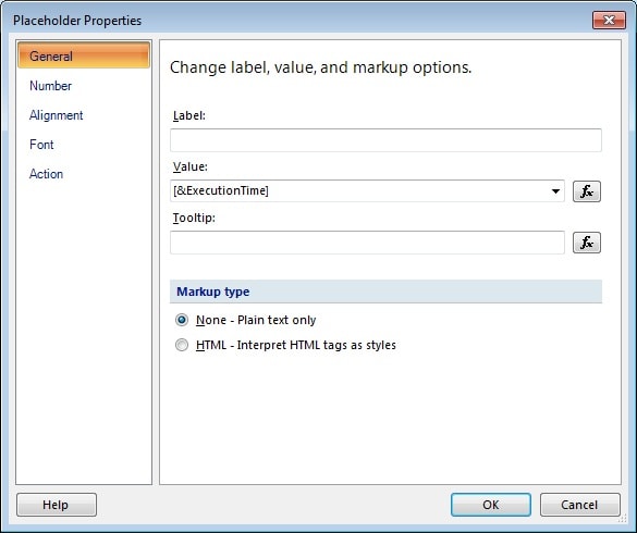 You can display additional or different information in the footer by adding a text box or modifying the text in the default text box. For this example, we’ll modify the existing text. To do so, double-click the &ExecutionTime placeholder to open the PlaceholderProperties dialog box, shown in Figure 14.