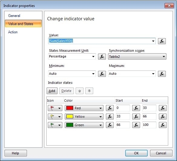 For our example, we’ll base our indicator on the SalesYTD column. In the Value drop-down list, select [Sum(SalesYTD)]. Our indicator will now be based on the total amount of sales listed in that column.