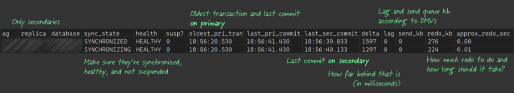 These won’t combine to give you some magical stopwatch or go/no go boolean but, if you monitor these leading up to the operation, they should give a good gauge about whether now is “the right time.” The query could possibly benefit from simplification and there are likely other columns you’ll want to look at: last_sent_time, last_hardened_time, last_redone_time, etc. The query above is what I used to determine the timing of my most recent planned failover.