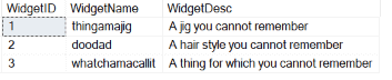 INSERT INTO Widget VALUES ('thingamajig','A jig you cannot remember'), ('doodad','A hair style you cannot remember'), ('whatchamacallit', 'A thing for which you cannot remember'); SELECT * FROM Widget; |