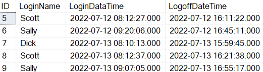 USE tempdb; GO CREATE TABLE dbo.LoginTracking ( ID INT IDENTITY(1,1), LoginName varchar(100), LoginDataTime datetime, LogoffDateTime datetime); GO INSERT INTO dbo.LoginTracking VALUES ('Scott','2022-07-11 08:41:31','2022-07-11 11:45:50'), ('Sally','2022-07-11 08:55:27','2022-07-11 11:59:59'), ('Dick','2022-07-11 09:05:17','2022-07-11 16:15:37'), ('Dick','2022-07-12 08:05:11','2022-07-12 15:50:31'), ('Scott','2022-07-12 08:12:27','2022-07-12 16:11:22'), ('Sally','2022-07-12 09:20:06','2022-07-12 16:45:11'), ('Dick','2022-07-13 08:10:13','2022-07-13 15:59:45'), ('Scott','2022-07-13 08:12:37','2022-07-13 16:21:38'), ('Sally','2022-07-13 09:07:05','2022-07-13 16:55:17'); GO CREATE TABLE dbo.LoginsToRemove( LoginName varchar(100)); GO INSERT INTO dbo.LoginsToRemove VALUES ('Sally'); GO |