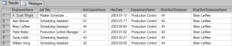 Let’s suppose I want to return all the employees from a specific department. I also want to know which employee had the largest number of hours not working because he/she was sick and who that employee was.