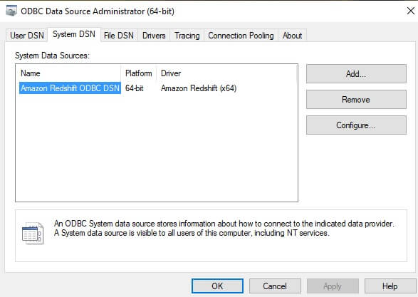 Once the driver is installed, an ODBC connection must be set up via the ODBC Data Source Administrator menu: