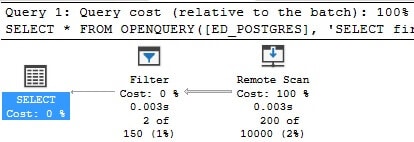 Note that the remote data source is scanned and then filtered afterwards. Had the remote table been large, then this query would have performed poorly in many ways: