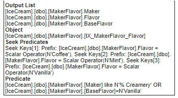 There is no index on the BaseFlavor column, but in the middle subquery from Figure 7 above, BaseFlavor is constrained on value ‘Vanilla.’ This suggests that the lower-level software might need a data structure(s) and algorithm(s) to support the restriction. To start the analysis, I’ll create this covering index, which parallels that on the Flavor column: