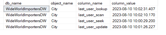 The values for the four columns last_user_lookup, last_user_scan, last_user_seek and last_user_update in the sys.dm_db_index_usage_stats are now showing as rows.
