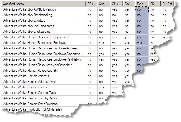 SELECT DB_NAME()+'.'+Object_Schema_name(t.object_ID)+'.' +t.name AS [Qualified Name], CASE WHEN OBJECTPROPERTY(object_id,'TableHasActiveFulltextIndex') = 0 THEN 'no' ELSE 'yes' END AS [FT index],--Table has an active full-text index. CASE WHEN OBJECTPROPERTY(object_id,'TableHasCheckCnst') = 0 THEN 'no' ELSE 'yes' END AS [Check Cnt],--Table has a CHECK constraint. CASE WHEN OBJECTPROPERTY(object_id,'TableHasClustIndex') = 0 THEN 'no' ELSE 'yes' END AS [Clustered ix],--Table has a clustered index. CASE WHEN OBJECTPROPERTY(object_id,'TableHasDefaultCnst') = 0 THEN 'no' ELSE 'yes' END AS [Default Cnt],--Table has a DEFAULT constraint. CASE WHEN OBJECTPROPERTY(object_id,'TableHasDeleteTrigger') = 0 THEN 'no' ELSE 'yes' END AS [Delete Tgr],--Table has a DELETE trigger. CASE WHEN OBJECTPROPERTY(object_id,'TableHasForeignKey') = 0 THEN 'no' ELSE 'yes' END AS [FK Cnt],--Table has a FOREIGN KEY constraint. CASE WHEN OBJECTPROPERTY(object_id,'TableHasForeignRef') = 0 THEN 'no' ELSE 'yes' END AS [FK Ref],--referenced by a FOREIGN KEY constraint. CASE WHEN OBJECTPROPERTY(object_id,'TableHasIdentity') = 0 THEN 'no' ELSE 'yes' END AS [Identity Col],--Table has an identity column. CASE WHEN OBJECTPROPERTY(object_id,'TableHasIndex') = 0 THEN 'no' ELSE 'yes' END AS [Any index],--Table has an index of any type. CASE WHEN OBJECTPROPERTY(object_id,'TableHasInsertTrigger') = 0 THEN 'no' ELSE 'yes' END AS [Insert Tgr],--Object has an INSERT trigger. CASE WHEN OBJECTPROPERTY(object_id,'TableHasNonclustIndex') = 0 THEN 'no' ELSE 'yes' END AS [nonCl Index],--Table has a nonclustered index. CASE WHEN OBJECTPROPERTY(object_id,'TableHasPrimaryKey') = 0 THEN 'no' ELSE 'yes' END AS [Primary Key],--Table has a primary key CASE WHEN OBJECTPROPERTY(object_id,'TableHasRowGuidCol') = 0 THEN 'no' ELSE 'yes' END AS [ROWGUIDCOL],--ROWGUIDCOL for uniqueidentifier col CASE WHEN OBJECTPROPERTY(object_id,'TableHasTextImage') = 0 THEN 'no' ELSE 'yes' END AS [Has Blob],--Table has text, ntext, or image column CASE WHEN OBJECTPROPERTY(object_id,'TableHasTimestamp') = 0 THEN 'no' ELSE 'yes' END AS [Timestamp],--Table has a timestamp column. CASE WHEN OBJECTPROPERTY(object_id,'TableHasUniqueCnst') = 0 THEN 'no' ELSE 'yes' END AS [Unique Cnt],--Table has a UNIQUE constraint. CASE WHEN OBJECTPROPERTY(object_id,'TableHasUpdateTrigger') = 0 THEN 'no' ELSE 'yes' END AS [Update Tgr]--Table has an Update trigger. FROM sys.tables t ORDER BY [Qualified Name] |
