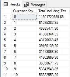 SELECT Customer.[Customer Key], SUM([Total Including Tax]) AS [Total Including Tax] FROM dbo.fact_order_BIG_CCI INNER JOIN Dimension.City ON fact_order_BIG_CCI.[City Key] = City.[City Key] INNER JOIN Dimension.Customer ON fact_order_BIG_CCI.[Customer Key] = Customer.[Customer Key] INNER JOIN Dimension.Employee ON fact_order_BIG_CCI.[Salesperson Key] = Employee.[Employee Key] WHERE [Order Date Key] >= '2015-01-01' AND [Order Date Key] < '2016-01-01' GROUP BY Customer.[Customer Key] ORDER BY Customer.[Customer Key]; |