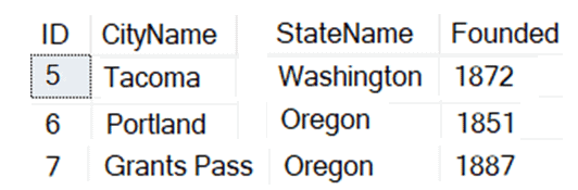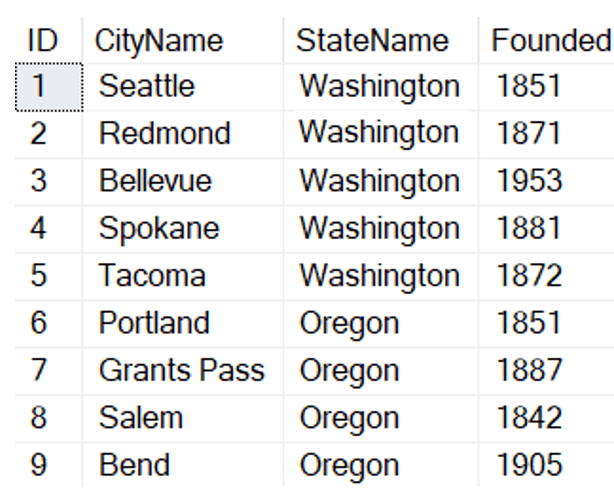 -- Create test data USE tempdb; GO DROP TABLE IF EXISTS TestData; GO CREATE TABLE TestData ( ID INT IDENTITY, CityName VARCHAR(20), StateName VARCHAR(20), Founded SMALLINT); --Insert rows of test data INSERT INTO TestData VALUES ('Seattle','Washington',1851), ('Redmond','Washington',1871), ('Bellevue','Washington',1953), ('Spokane','Washington',1881), ('Tacoma','Washington',1872), ('Portland','Oregon',1851), ('Grants Pass','Oregon',1887), ('Salem','Oregon',1842), ('Bend','Oregon',1905); |