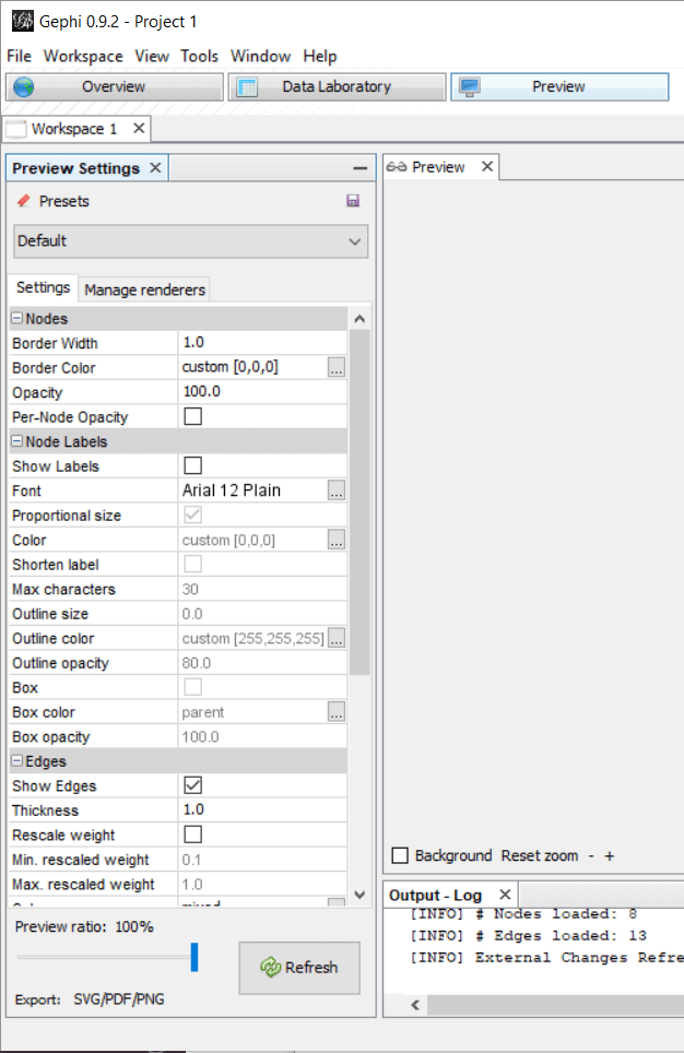 After this first screen, you will see the Workspace1 and Preview tabs and Preview Settings window. It’s time to build the graph.