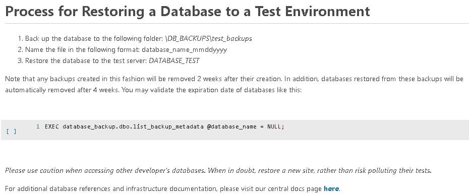 This is a relatively simple example, but it illustrates the value of embedding code into a how-to doc. The reader can copy and use the code as needed or run it inline within the notebook. This is especially useful when the code is more complex or when it changes often and maintaining central documentation is important. Version controlling a SQL Notebook in GIT or another source control app is also a valid way to track documentation changes over time, if this fits into your version control infrastructure.