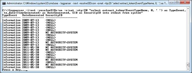 logparser -i:evt -resolveSIDs:on -o:nat -rtp:20 "select extract_token(EventTypeName, 0, ' ') as TypeEvent, to_date(TimeGenerated) as DateGenerated, SID as SecurityID into stdout from system" |