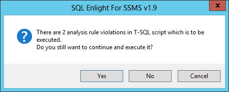 The final tab allows you to control the behavior of SQLEnlight within SSMS. First, you can decide if you want the automated analysis to occur before either the execution or parse of the commands (that’s still independent of SQL Server behavior as was noted in the previous tab). I’ve enabled both for the experiment. You also get to decide which rules are applied. I’ve got mine set to the default which is for all rules that are enabled; Active Rules. You could instead decide which rules you want to run on the fly.