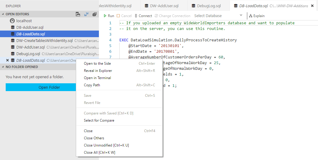 Open to the Side opens the file in split screen, so you can compare two files side by side in SQLOPS. Reveal in Explorer opens up an Explorer window in your computers operating system. Open in Terminal opens up a terminal window in the lower half of the SQLOPS application, by default it is PowerShell, but it can also be changed to a Command Prompt (CMD), or a BASH terminal. This may vary by operating system, for example on macOS you wouldn’t have the option for a CMD window. You can also open a terminal window by using the View menu in the toolbar, and selecting Integrated Terminal.