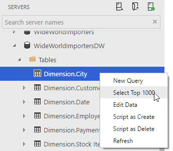 At this point you should have a good overview of the SQLOPS interface. Let’s start doing some actual work and do one of the most common things, running a query. From the Servers pane, expand your databases, then expand one database, then the tables for that database. For this example, I’ll be using the WideWorldImportersDW database.