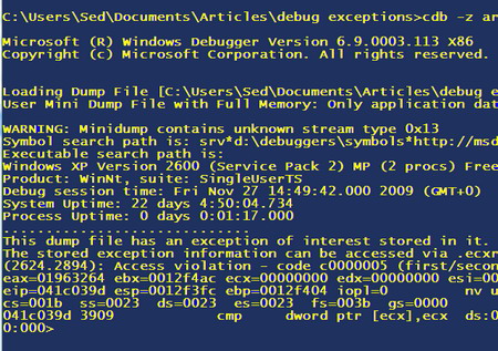 There are two main cases where you would probably need to debug using a memory dump. The first case is that your application has had an unhandled exception and crashed, and all you have is a memory dump. The second case is where you get an exception, or a specific behaviour in a production environment, and you can’t leave a debugger attached while you troubleshoot as it could interrupt the user service. Instead you could attach cdb, create the dump file at the right place and then detach the debugger, this would mean that the application continues with only a small interruption in service. Of course, depending on your environment, this is not always possible but can be sometimes be your only option.