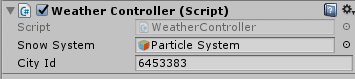The next method to create is responsible for checking whether it is snowing or not in the city that was provided. You will also add another public field named SnowSystem and make sure that it’s linked from the Unity editor. To do this, select the empty game object that was created earlier and drag and drop the particle system object into the slot.