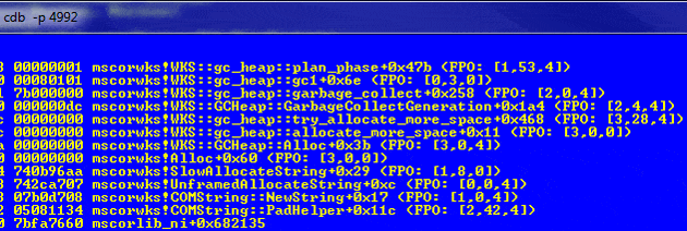 Now this is more interesting, as it shows that we moved from mocorlib_ni into mscorwks and a method called PadHelper, which shows that we are definitely in the right place and have the correct symbols (otherwise we might have gotten another method here). What we see is that we get a call to “gc_heap::GarbageCollect“, even though we haven’t done anything to cause a garbage collection in our code (think GC.Collect).