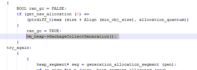 To find WKS::GCHeap::Alloc, look in “clr\src\vm\gcsmp.cpp“; on line 5307, it calls gc_heap::allocate, which we don’t see in the stack trace because the gc_heap::allocate method is marked with “inline“. This method checks to see if there is enough memory available on the heap and, if there isn’t, then it tries to allocate more space in the heap by running a garbage collection. You can see the garbage collection being run in the method gc_heap::allocate_more_space which calls vm_heap->GarbageCollectGeneration(). If there is then enough space, then gc_heap::allocate attempts to allocate the memory: