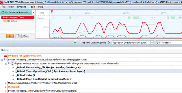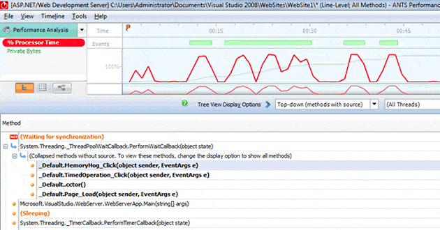 The users are complaining about the response time when clicking on the third button, so that is where we focus our attention; while we do see some CPU peaks in ANTS, these are not related to problem method being called by the third button: TimedOperation_Click. If you look at the screenshot below (figure 3), we can see a number of CPU peaks (the red trace line at the top), and the green bars in the events row are where the selected stack is being called. Significantly, we can quickly identify that, at the times of high CPU load, our TimedOperation_Click method was not involved.