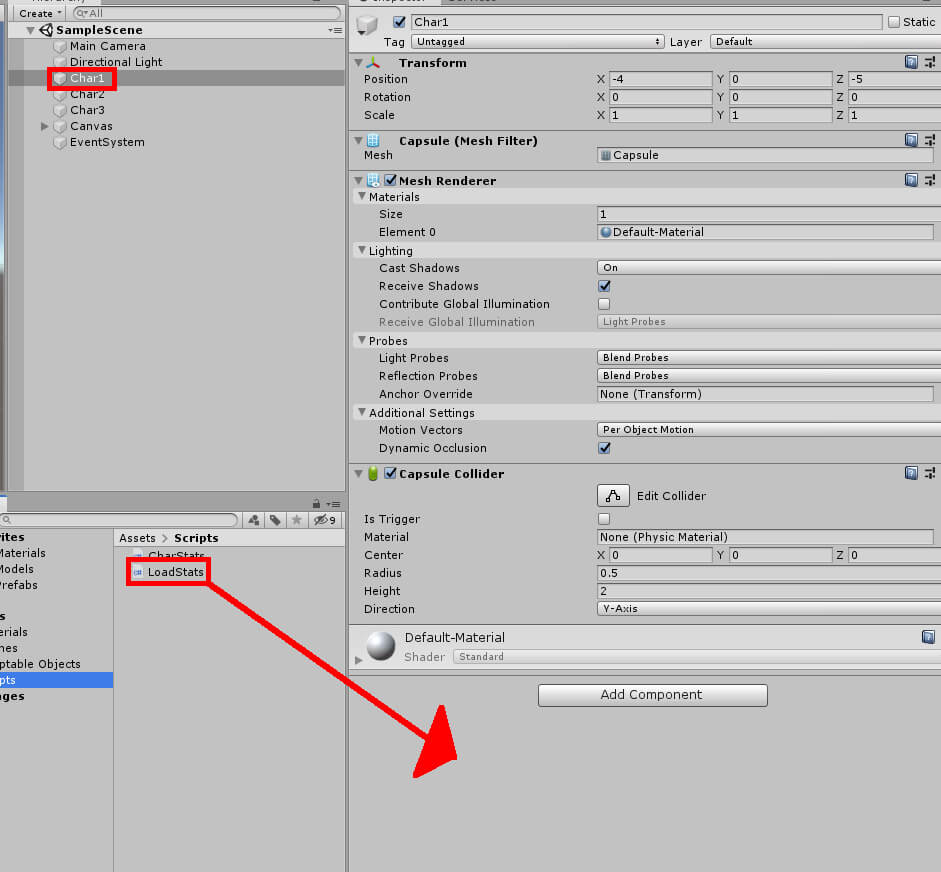 Create two more Scriptable Objects and do the same as before, giving them different values for the different fields. Once that’s done, move to the Hierarchy window and select one of the char objects. Then give them the LoadStats script as a component by navigating to the Scripts folder in the Assets window, finding LoadStats, and dragging it into the Inspector window as shown in Figure 12.