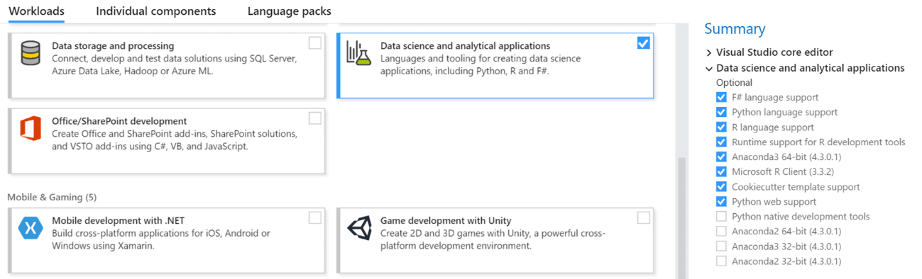 Everything you’ll need to follow along with this article is the latest version of Visual Studio (the Community edition is just fine). However, most .NET developers complete the installation selecting only the single options available for .NET desktop development and the Universal Windows Platform for C#. In this case, you’ll also need to select the Data science and analytical applications workload, as you can see in Figure 2. This option will install the data science languages (R and F#) you will need to implement the machine learning code. It’s available during the VS installation process only (if you already have VS installed, you can run the installer again and select the proper workload).