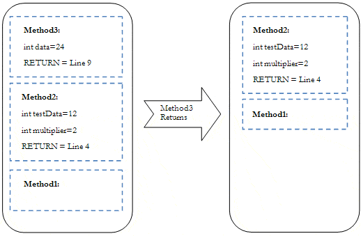 In Figure 1, stack frames for Methods 1,2 and 3 have been stacked on top of each other, and at the moment the current stack frame is Method3 , which is the current executing method. When Method3 completes execution, it’s stack frame is removed, the execution point moves to Method2 (line 9 in Listing 1), and execution continues.