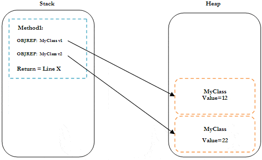 As we can see in Figure 2, To achieve this, .NET has to create the object on the memory heap, determine its address on the heap (or object reference), and place that object reference within the stack frame for Method1 . As long as Method1 is executing, the object allocated on the heap will have a reference held on the stack. When Method1 completes, the stack frame is removed (along with the object reference), leaving the object without a reference.