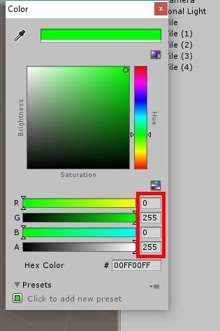 You’ll be greeted with Unity’s color picker. This is where you will set the color of the material. Give this material the RGB value of 0 red, 255 green, 0 blue, and 255 alpha (lowering the alpha will give you an invisible material, which won’t be helpful for this project). Figure 13 shows how to set the color of the Green material.