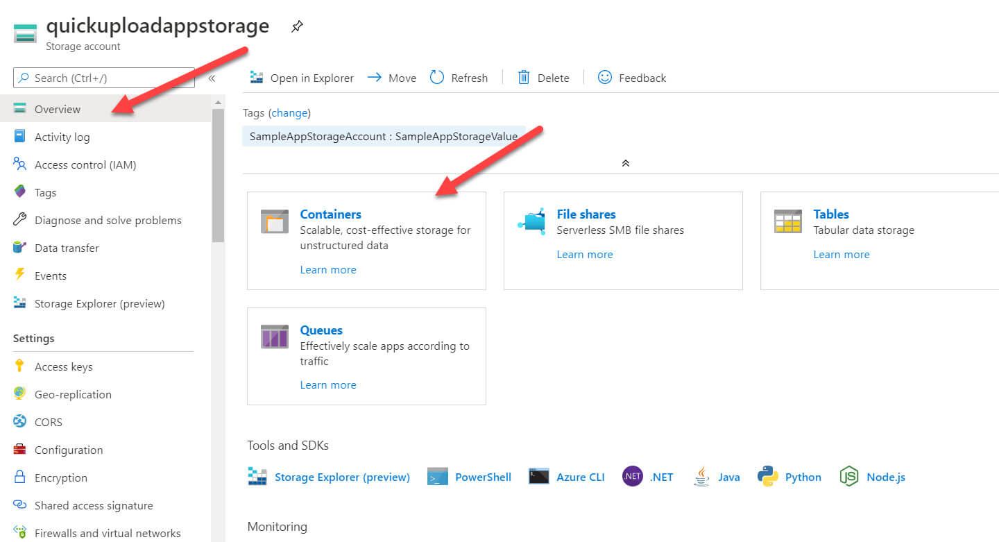 - Add a new container to upload the image. For this click on the Overview option and click the Containers.