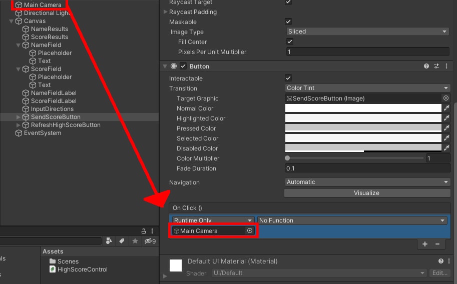 Drag the Main Camera object into the object field. Why the Main Camera object in particular? Because it’s the object with the HighScoreControl script attached to it.
