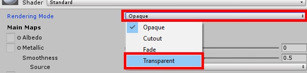 Immediately after creating the material, navigate to the Inspector window and set its rendering mode to Transparent like Figure 10.