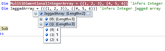 Dim IntegerArray = {1, 2, 3, 4, 5} 'compiler infers automatically as Integer Dim DoubleArray = {1.4, 2.3, 3.5} 'compiler infers automaticallyas Double Dim StringArray = {"Hima", "Jacob", "Pinal"} 'compiler infers automatically as String |