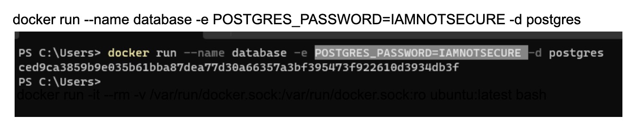 Most of the time, the System Administrator follows the common practice of connecting the sockets as volumes to provide containers with API access; this allows containers to monitor and analyze other containers. If the Administrator mounts /var/run/docker.sock to a container, it can access the API even if it’s mounted as a read-only volume. This configuration allows the container full access to docker on the host. An attacker can use this misconfiguration to escape isolation and create another container with arbitrary volumes and commands. It is even possible to remote shell on other containers. Follow the below example of leaking Postgres password information,