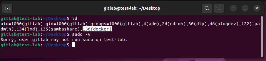 The following image shows that an unprivileged gitlab user belonging to the docker group cant access the/etc/shadow file to get the Administrator hash; he can obtain those running containers in Fig 1.8