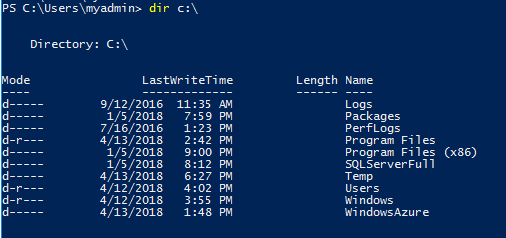 You will find that managing the SQL Server instance is similar to managing a traditional instance, but since the container runs in its own space, there are a few differences. Since the container lives in its own space, it cannot see outside that space. For example, it cannot directly backup to a folder outside the container. To demonstrate, first list the directory contents of the C:\ drive on the VM.