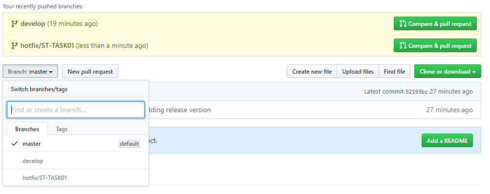 The release branch had changes that were merged onto the master; git-flow also back-merges the same commits against the develop branch. Plus, a new tag was generated: ST0.1.0. You must push all these updates through the following command: