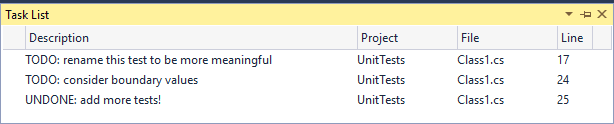 Occasionally as you write code you will choose to skip over some detail for the moment, fully intending to come back later and correct or expand upon it. A common convention is to use a special prefix within a comment to mark such places, be it “TBD” or “FIXME” or “!!!!!!!!!!!”. In Visual Studio, if you begin comments with the label “TODO” or “UNDONE”, those tagged comments are conveniently collected into the Task List window for you. For this C# sample…