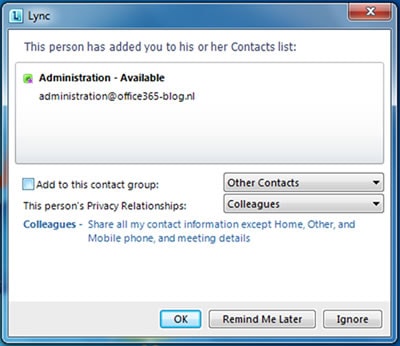 Once you’re logged in to the client, you’re ready to go; you can start adding contacts, and other people can start adding you as a new contact. This all behaves exactly as if your Lync service was being hosted locally. So, when somebody does add you as a contact, a pop-up invitation is shown, which you can either accept the invitation (and add this contact to a group in your Lync client), or just ignore it: