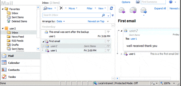 Finally, looking at the mailbox of User2 again after the restore process, we can see a complete recovery of all the data. Even the email that was received after the backup was recovered, thanks to the log replay.