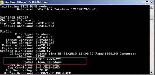 Running eseutil /mh “Mailbox Database.edb” one last time will reveal that the database is now in a “Clean Shutdown” state, and ready to be mounted: